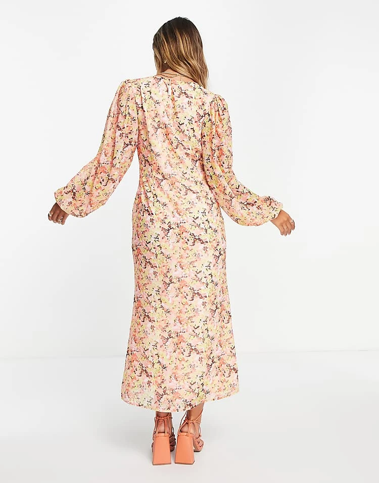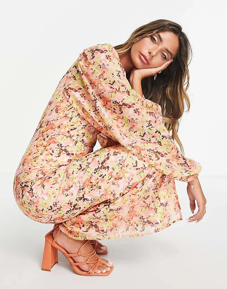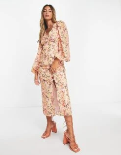 Pretty Lavish Long Sleeve Ruffle Midaxi Dress In Green And Fuchsia Floral For Women Green & Fuchsia