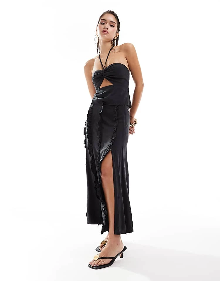 Pretty Lavish Textured Halter Top, Skirt And Trouser Co-ord In Black